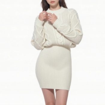 Fleepmart New Pink Vintage O Neck Slim Fried Dough Twists Women’s Knitted Dress Autumn Winter Korean Bat Sleeve Thickened Women’s Dress