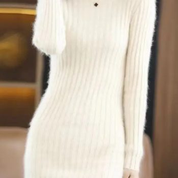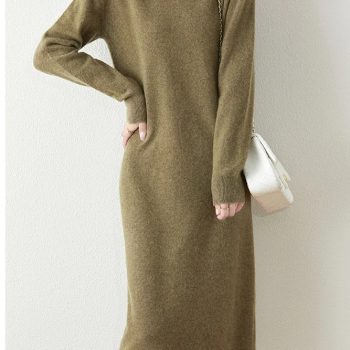 Fleepmart Autumn Winter Women’s Wool Long Dress Cashmere Mock Neck Pullover Sweater 100% Merino Wool Soft Knitwear OL Simple Basic Dress