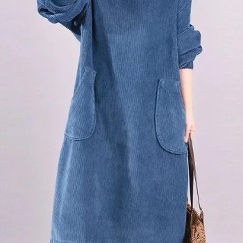 Fleepmart Women Autumn Winter Dress New Retro Corduroy Vestidos Add Velvet High Neck Dress Mid-Length Loose Pullover Sweater Female