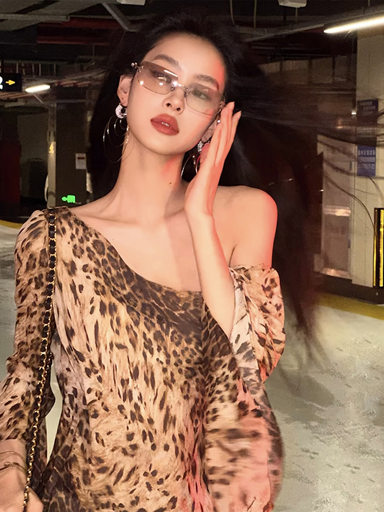 Fleepmart Irregular Flare Sleeve Women Dress Leopard Print Y2K Skew Collar Sexy Midnight Coquette Clubwear Skinny Chic Mini Bodycon