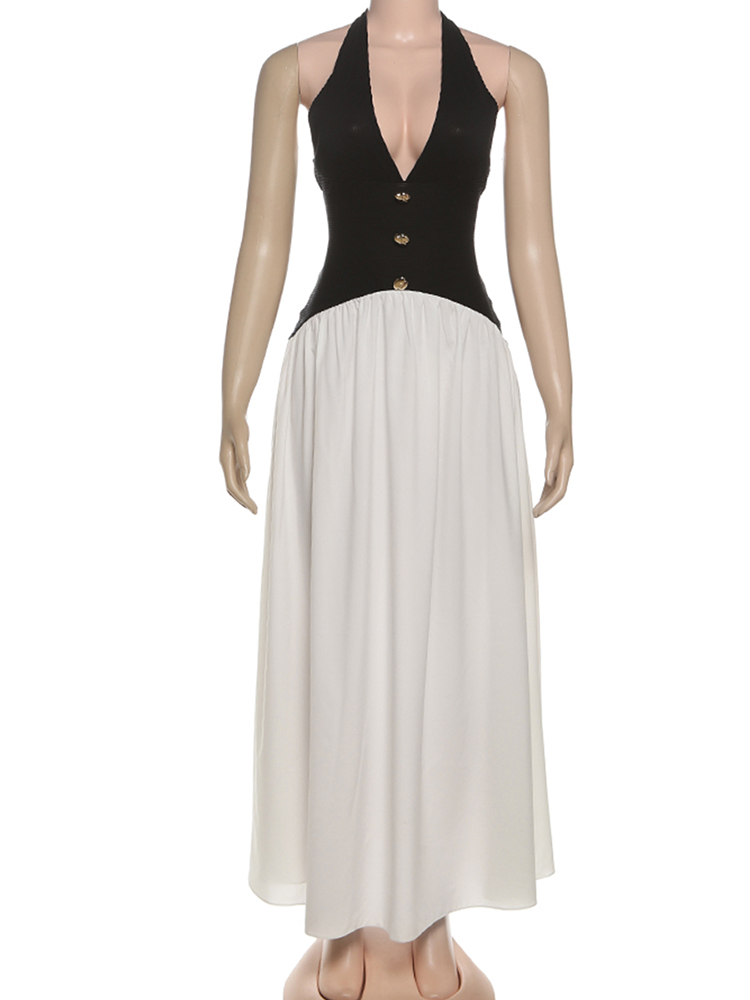 Fleepmart Halter Backless Long Dress Women Low-Neck Sleeveless Metal Buckle Contrast Design Ruched Hem Street Elegant Vestidos