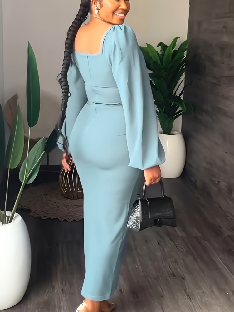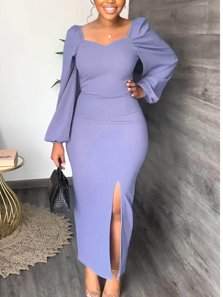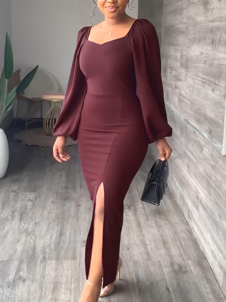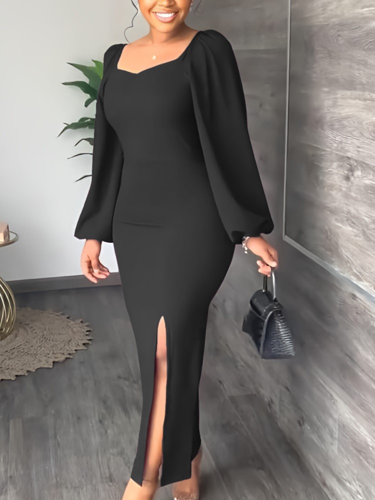 Fleepmart Elegant Women Square Neck Long Sleeve Side Split Dress Spring Summer Fashion Solid Slim Office Lady Midi Dresses Femme Robe
