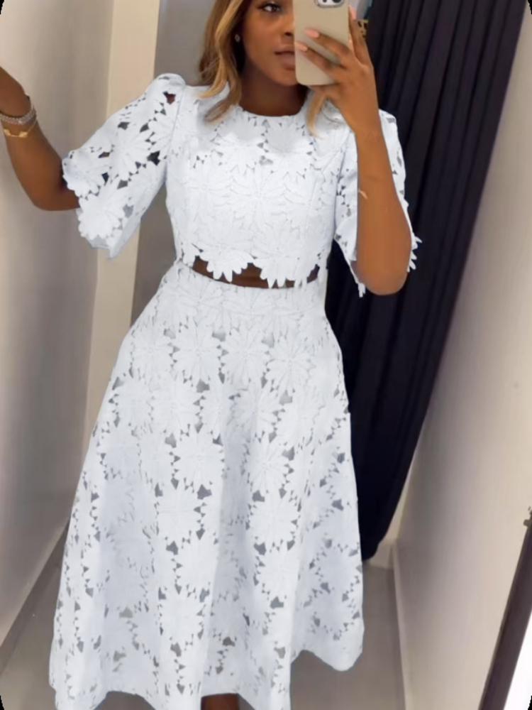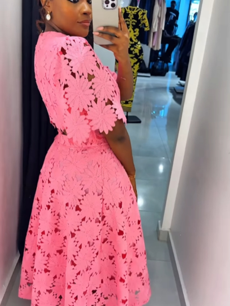 Fleepmart French Style Hollow Out Top and Pants Set Fashion Casual Two Piece Outfit for Women Garden Party Dress Pink Wedding Guest Dress