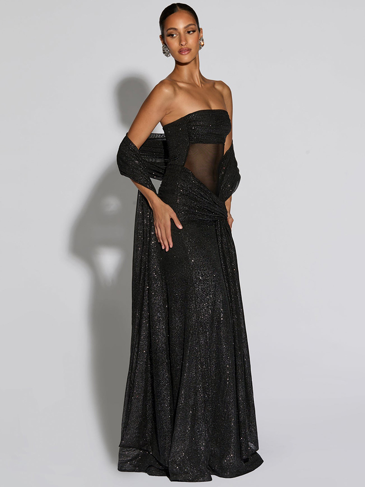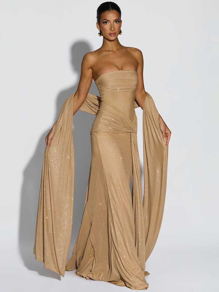 Fleepmart Sparkle Strapless Draped Sexy Maxi Dress Women Elegant Off-shoulder Sleeveless Backless Ruched Club Party Long Dress