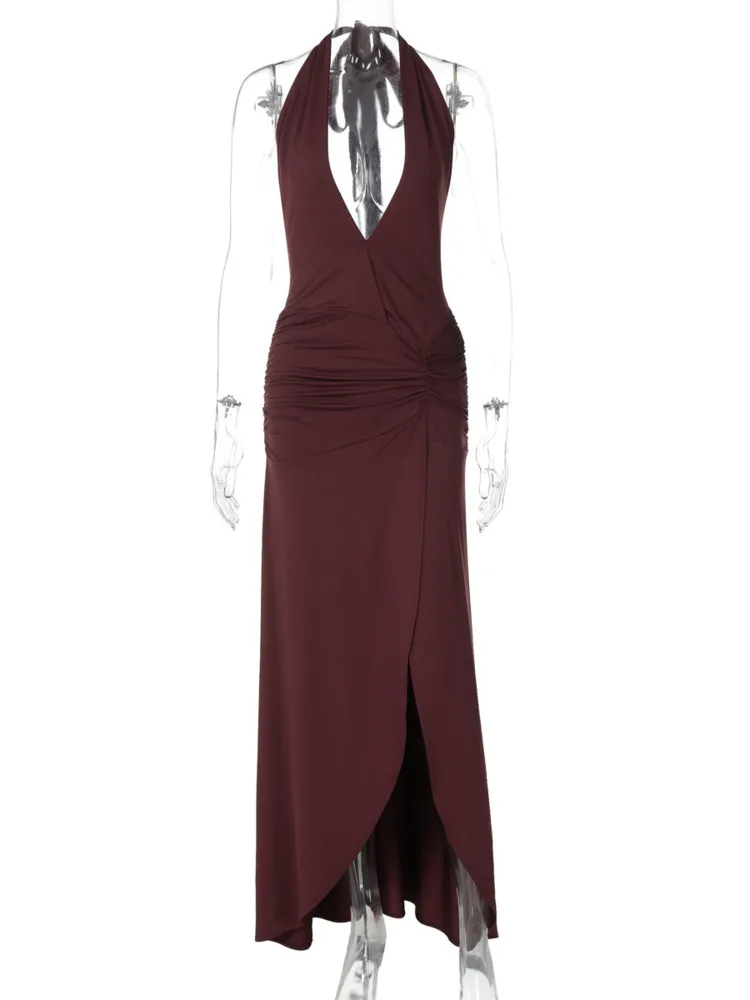 Fleepmart Halter Deep V-neck Sexy Maxi Dress for Women Hollow Out Thigh Split Off-shoulder Sleeveless Backless Club Party Dress