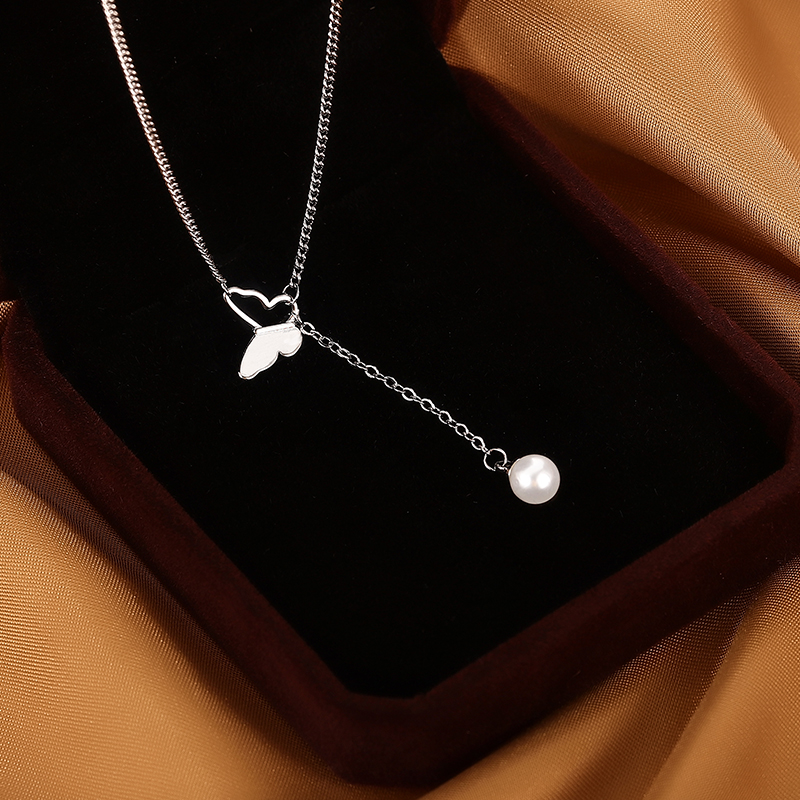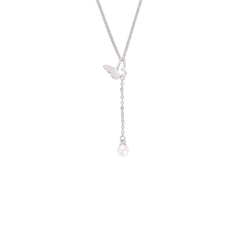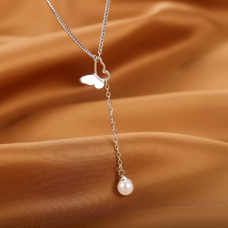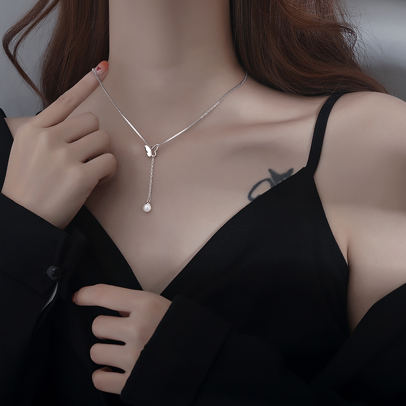 Fleepmart 925 Sterling Silver Butterfly Necklace Tassel Pearl Clavicle Chain Female Simple Retro Long Sweater Chain New Jewelry Party Gift