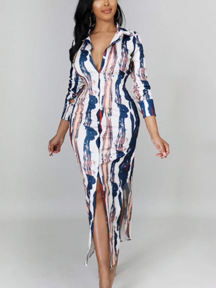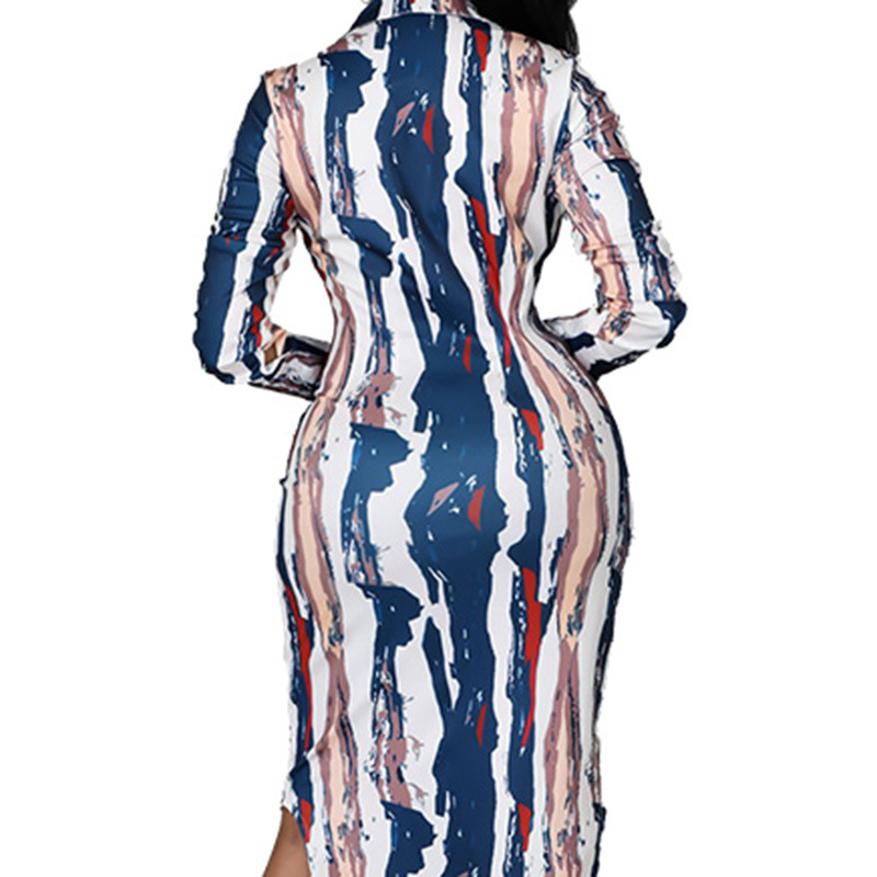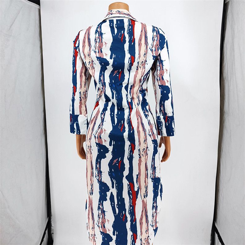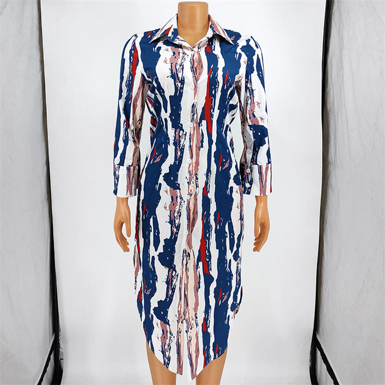 Fleepmart Print Shirt Dresses Women Strip Turn Down Collar Button Slit Autumn Spring Casual Daily Female African Elegant Fashion Gown 2022