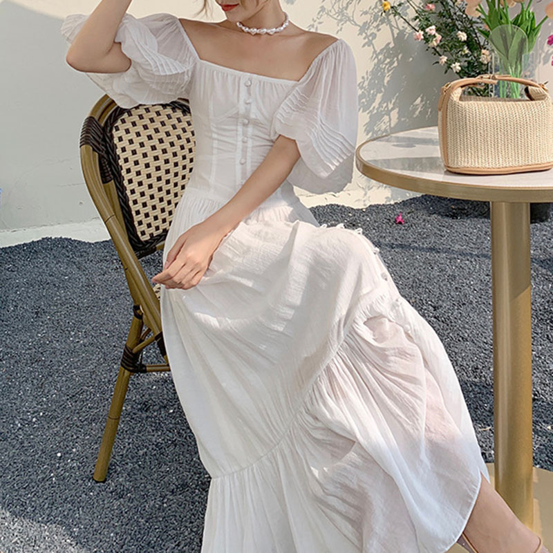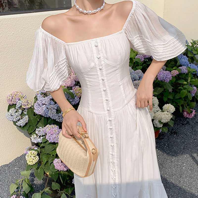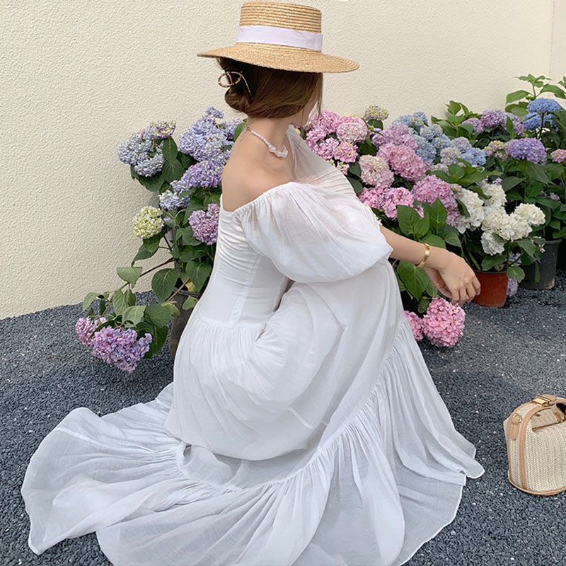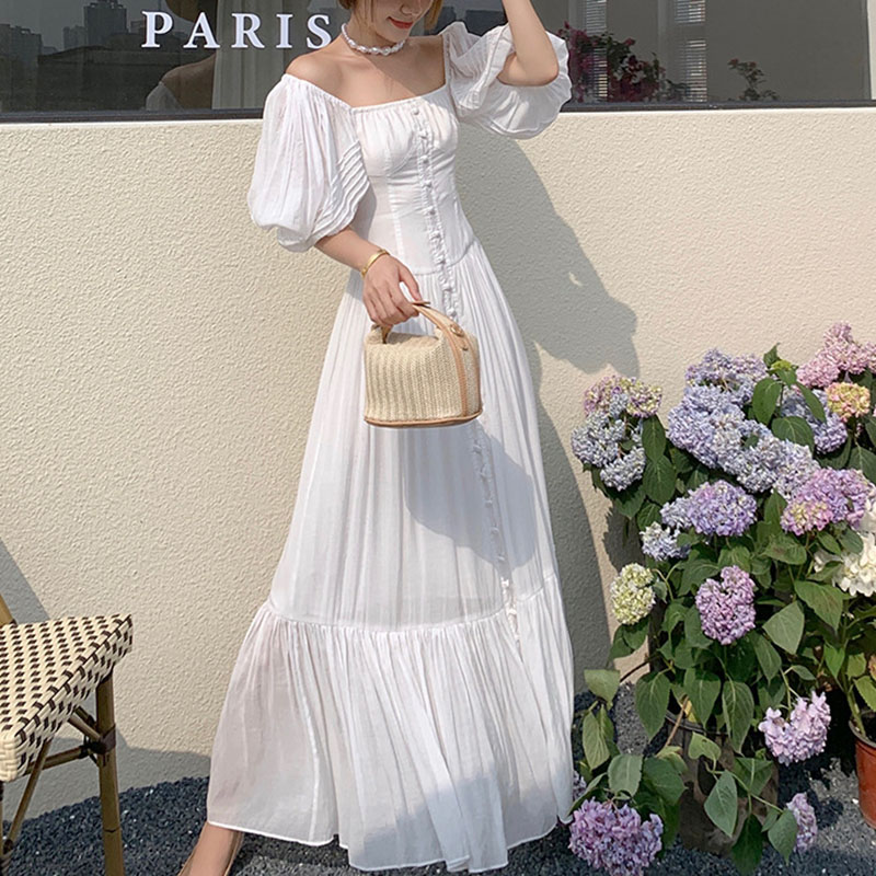Fleepmart 2022 Summer Women White Maxi Dress Half Sleeve Vintage Slash Neck Off Shoulder Long Tunic Beach Dress Vocation