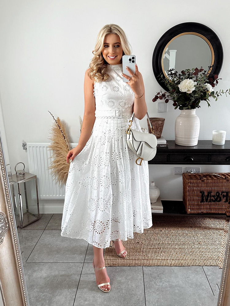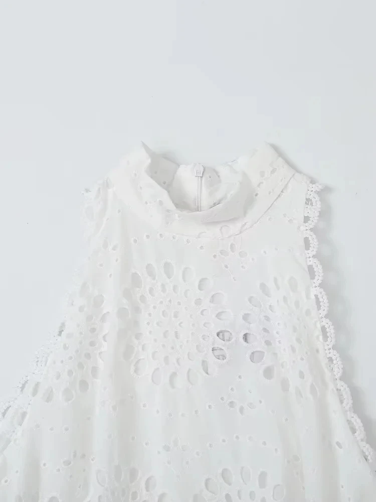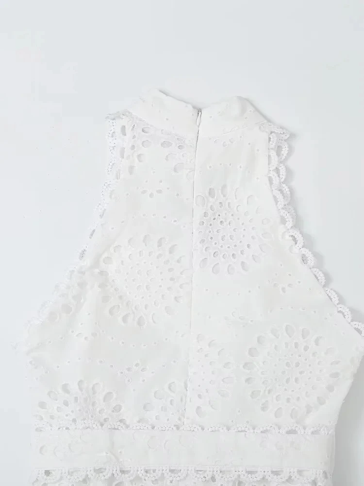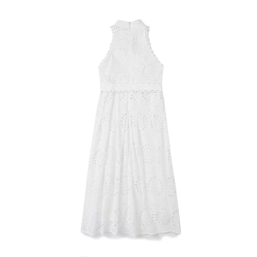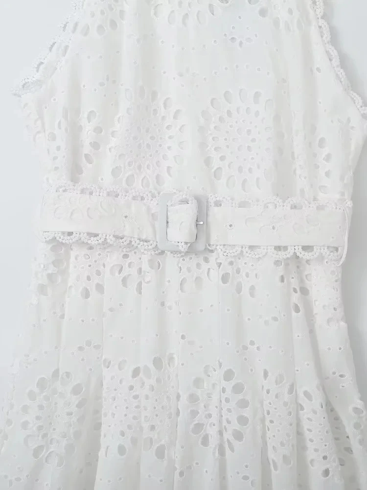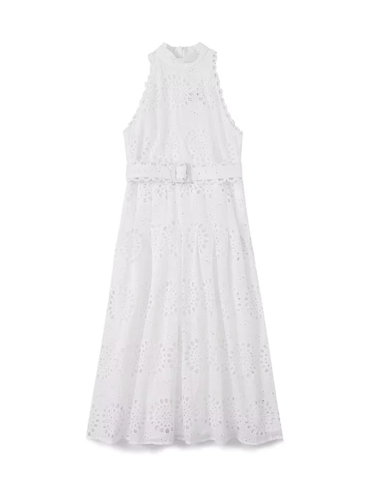 Fleepmart Cotton White A-line Hollow Out Belt Casual Maxi Long Summer Women Dress Halter Sleeveless Sundress Robe Party Vestidos 2024