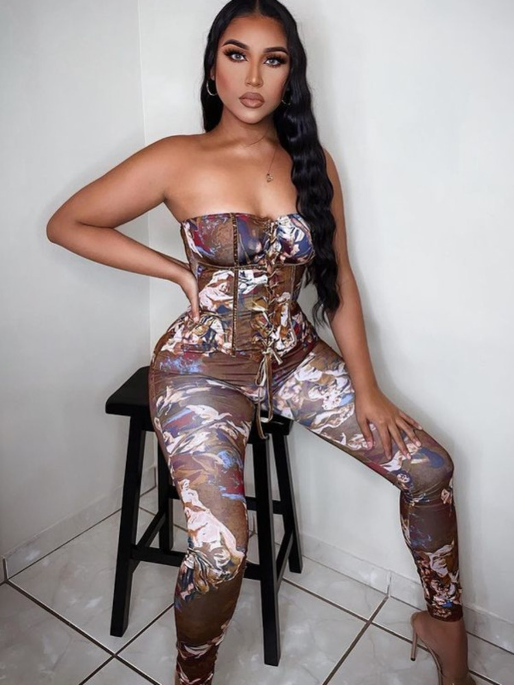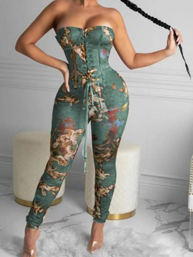 Fleepmart Print Off Shoulder Women Jumpsuits Sexy Lace Up Workout Active Wear Fashion Overalls One Piece Bodycon Romper