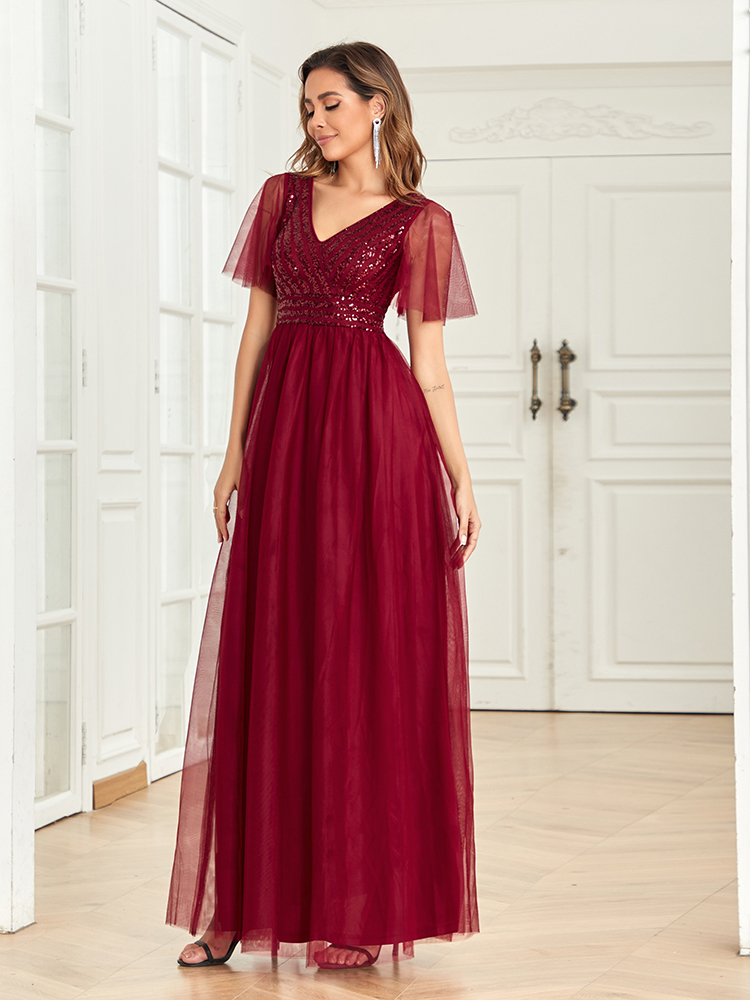 Fleepmart New V-Neck Burgundy Elegant Formal Dresses A-Line Tulle Sequin Short Sleeve Wedding Party Bridesmaid Long Dress