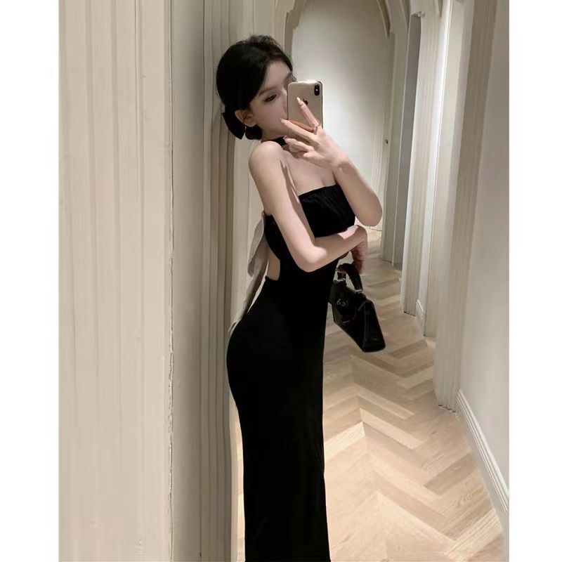 Fleepmart Long Dresses Women Backless Bow Hollow Out Vintage Sexy Elegant French Style