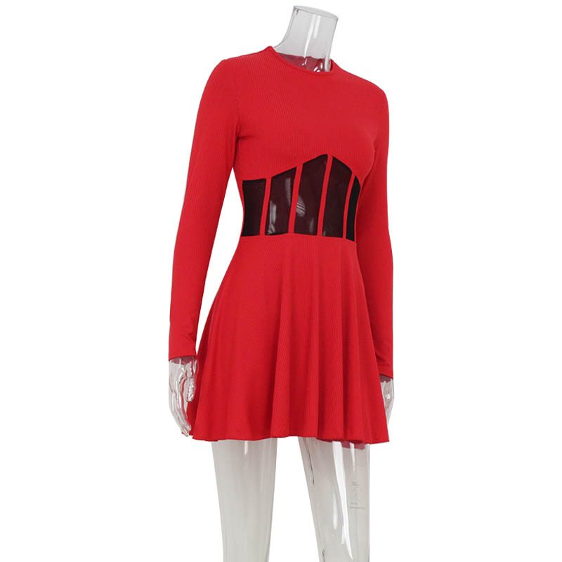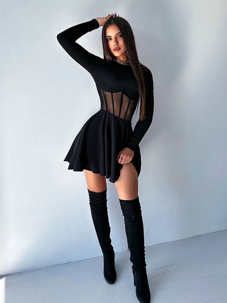 Fleepmart Solid Women’s Mini A-Line Knitted Sheer Slim Fit Long Sleeves Bodycon O-Neck Party Streetwear Vestidos
