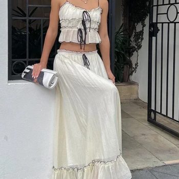 Fleepmart Halter Neck Long Skirt Suit Women Summer Party Beach Backless Sling Top + Lace Up Fold Maxi Skirts 2 Piece Set Female Outfits
