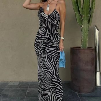 Fleepmart autumn new women’s fashionable slim fit long ruffle animal print backless suspender dress