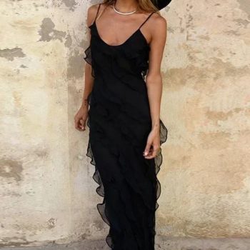 Fleepmart Sexy Ruffles Maxi Robes Women Slim Fit Backless V Neck Long Dresses 2025 New Vacation Beach
