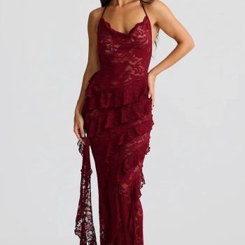 Fleepmart Lace Backless Sexy Maxi Dress Women Gown Halter Lace-up Sleeveless Bodycon Elegant Ruffle Beach Club Long Dress 2025