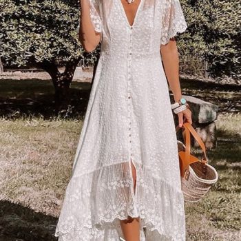 Fleepmart 2022 Women Boho Maxi Dress Floral Embroidery Single Breasted Summer Vocation White Lace Sexy Tunic Long Beach Dress