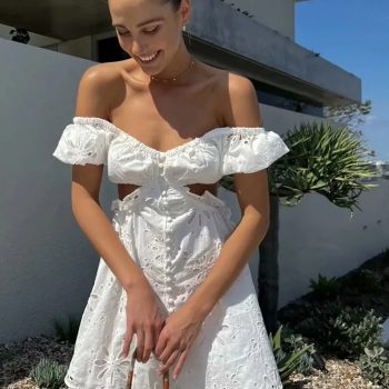 Fleepmart White Lace Cotton Dress V Neck Off Shoulder Sexy Beach Short Dress Summer Women Buttons Cut Out Mini Beach Sundress 2024