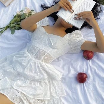 fleepmart Bowknot Tiered White Lace Summer Short Dress for Petite Women Puff Sleeve Flower Embriodery Zip Mini Beach Party Vestido