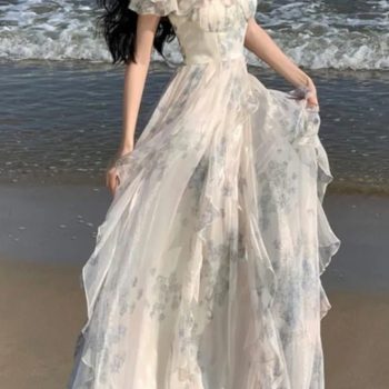 Fleepmart Women Elegant Printed Long Midi Runway Dress French Square Neck Sfemale Summer Seaside Holiday Beach Dresses