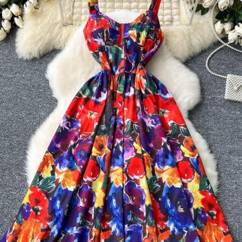Fleepmart Bohemian Summer Women Spaghetti Strap Dress 2024Runway Fahsion Flower Print Bow Long Beach Party Vacation Camisole