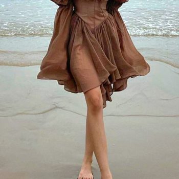 Fleepmart Retro Chic Brown Corset Pleated Summer Dress Off Shoulder Fashion Ruffles Patchwork Beach Women’s Dress Sexy Sundress