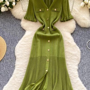 Fleepmart Brand Fashion Vintage Knitted Long Dress Spring Summer Women Elegant V-neck Ruffled Bodycon Sweater Dress Party Vestido