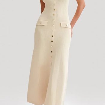 Fleepmart Summer Elegant Lady Knitted Single Breasted Long Dresses Women Solid Sleeveless O Neck Button Bodycon Party Female Vestidos