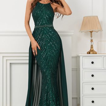 Fleepmart Shinning Sequins Evening Party Dress Sleeveless High Neck Slim Side Split Gown Robe Sexy Vestidoes Prom Dress