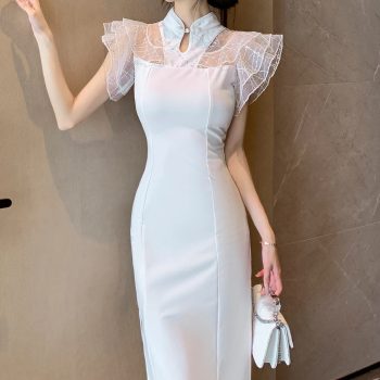 Fleepmart Fashion White Transparent Mesh Ruffle Edge Standing Collar Splitting Split Dress Women’s Elegant Slim Bodycon Party Club Dress