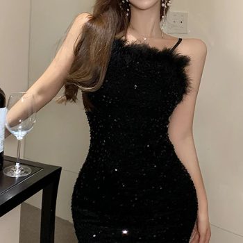 Fleepmart Sexy Party Dress Luxury Shining Bling Sequins Fur Spaghetti Strap Bodycon Tight Sheath Dress Night Club