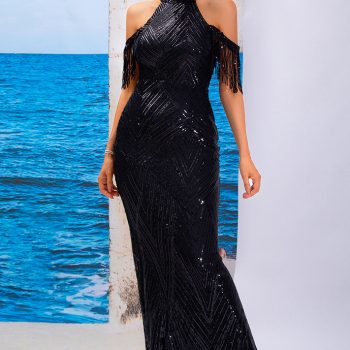 Fleepmart Sexy Black Halter Neck Off-The-Shoulder Geometric Reflective Stretch Fishtail Dress