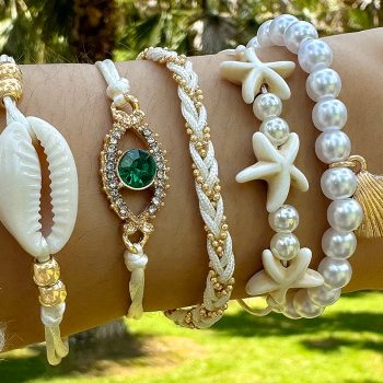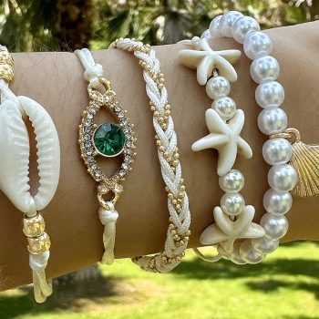 Fleepmart 5pcs/set Bohemian Imitation Pearl Bracelets for Women Ethnic Style Shell Beaded Bangles Summer Beach Jewelry Set
