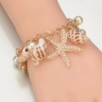 Fleepmart Gold Color Metal Starfish Conch Charm Women Bracelet Imitation Pearl Natural Conch Cute Summer Bracelet Y2K Fashion Jewelry