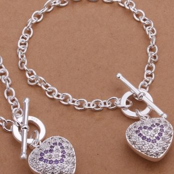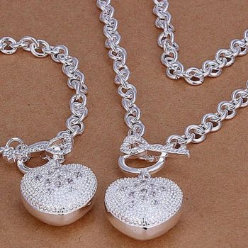 Fleepmart 925 Sterling Silver Valentine's Day gift noble cute women lady zircon crystal heart pendant necklace bracelet charm Jewelry Set