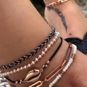 Fleepmart Bohemian Pearl Beads Shell Conch Chain Black Rope Beaded Anklet Set for Women Beach Adjustable Bracelet Foot Jewelry 8007