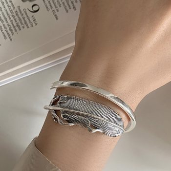 Fleepmart New Retro Distressed Thai Silver Simple Big Feather Open Bracelet Light Luxury Couple Party Jewelry Exquisite Women