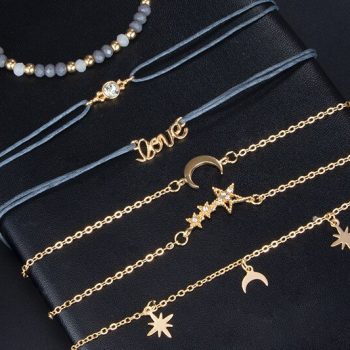 Fleepmart Bohemia Love Moon Bracelets for Women Charms Bead Gold Star Clear Crystal Stone Letter Rope Jewelry Accessories