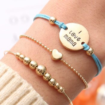Fleepmart 3 Pcs/Set Bohemian Classic Heart Blue Rope I LOVE MAMA Letter Woven Gold Beaded Bracelet Set Women Jewelry Mother Gift
