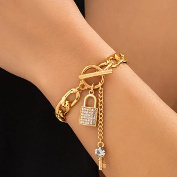 Fleepmart Steampunk Metal Thick Chain Bracelet Women’s Exquisite Rhinestone Lock Key Pendant Buckle Bracelet Trendy Jewelry Gifts