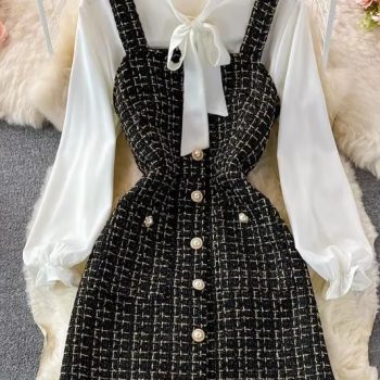 Fleepmart Elegant Chiffon Shirt Tweed Dress Sets Women Long Sleeve Lace Up Bow Sling Plaid Dress