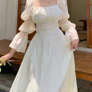 Fleepmart Puff Sleeve Women Solid French Style Retro Square Collar Spring Autumn Stylish Backless Bow Hollow Out Elegant