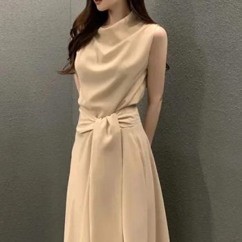 Fleepmart Korean Chic Sleeveless Midi Dress Spring Elegant Hepburn Style Pile Nock Lace-Up A Line Dress Lady Fashion Loose Casual Clothes