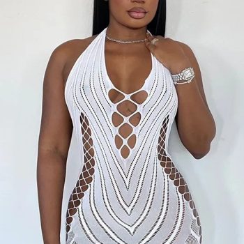 Fleepmart Sexy Fishnet Halter Backless Low Cut Tight Pencil Cute Mini Short Nightclub Dance Women Dress