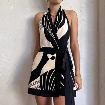 Fleepmart Sexy Printed Women Mini Dress Backless Streetwear Regular Casual Halter V-neck Slim Skinny Vestidos