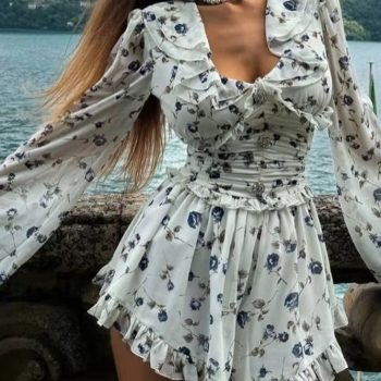 Fleepmart Flower Print Mini Summer Women O Neck Long Sleeve A Line Robe Mesh Patchwork Elegant Dress
