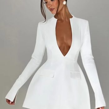Fleepmart Elegant Women’s Deep V-neck A-line Blazer Long Sleeve High Waist Tunics Short Dress
