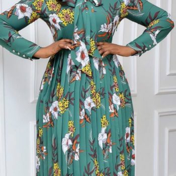 fleepmart Women Printed Pleated Dress Long Sleeves with Bowtie Floral Knee Length Elegant Office Ladies Classy Fashion