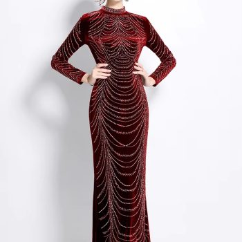 Fleepmart Autumn Winter Women Elegant Diamond-Ironing Velvet Dress High Quality Long Maxi Cocktail Party Vintage Pencil Designer